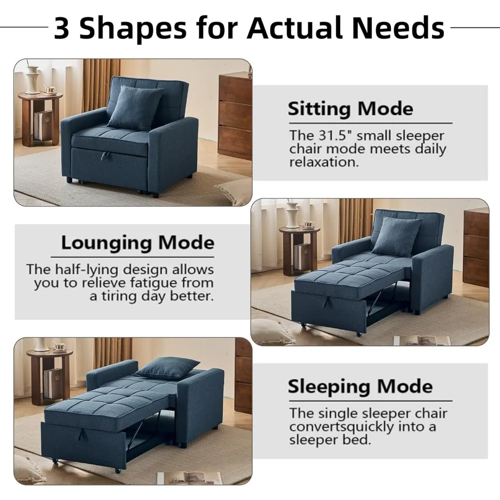 This 3-in-1 convertible sofa bed combines comfort, versatility, and style for any living space. It functions as a sofa, sleeper bed, and futon couch, adapting to your needs. The reclining backrest provides customizable comfort for lounging or napping. A convenient side pocket keeps remotes, magazines, or small items within reach. The pull-out bed transforms the sofa into a comfortable sleeping area in seconds. Crafted from durable materials, it ensures long-lasting use and stability. Its compact size fits apartments, bedrooms, or living rooms with limited space. The stylish blue upholstery adds a modern touch to any décor. Lightweight yet sturdy, it’s easy to move and reposition. Enhance your home with this multifunctional, comfortable, and practical sofa bed.