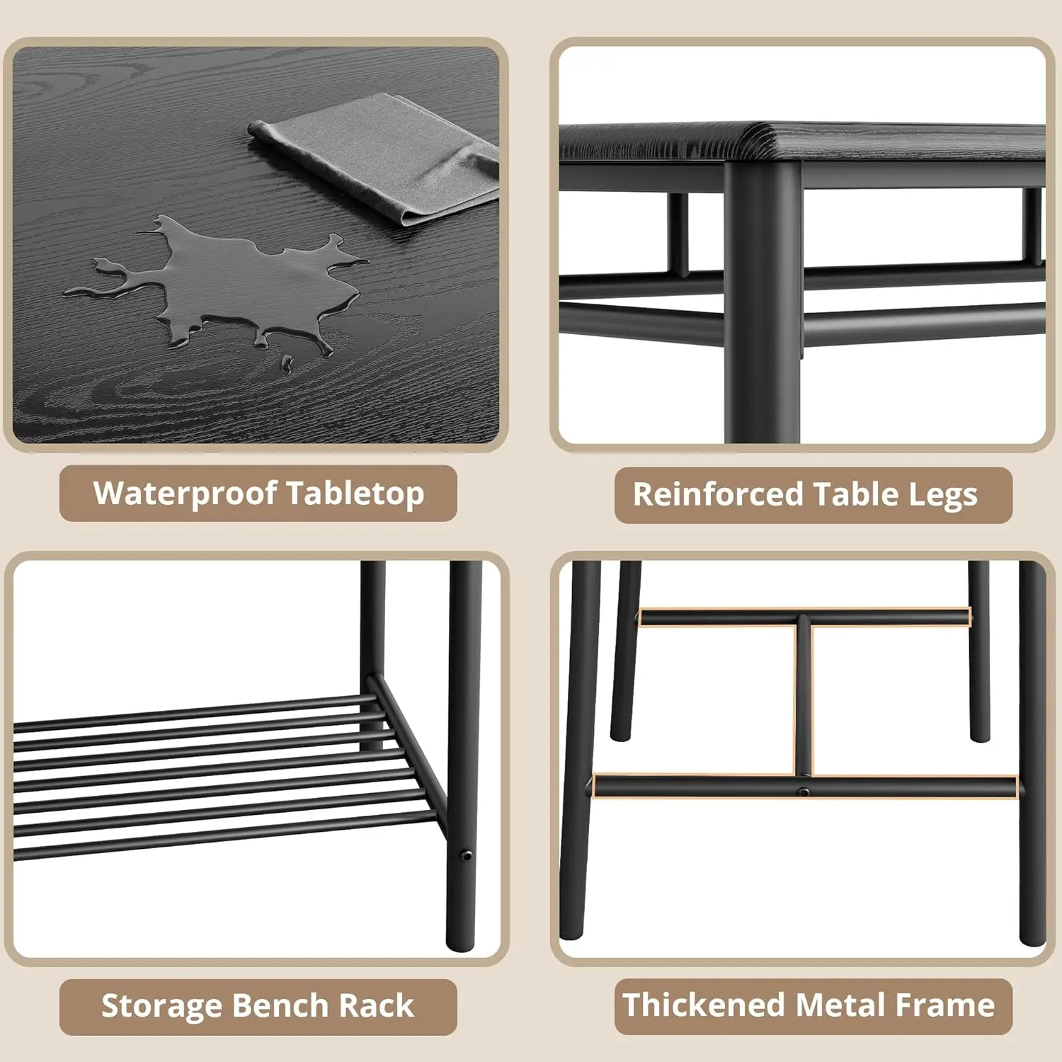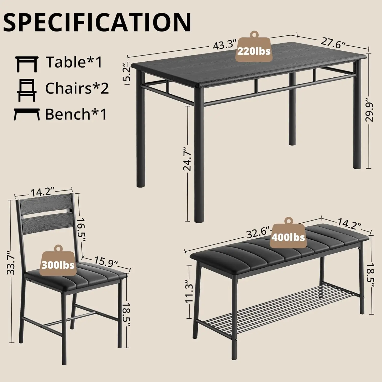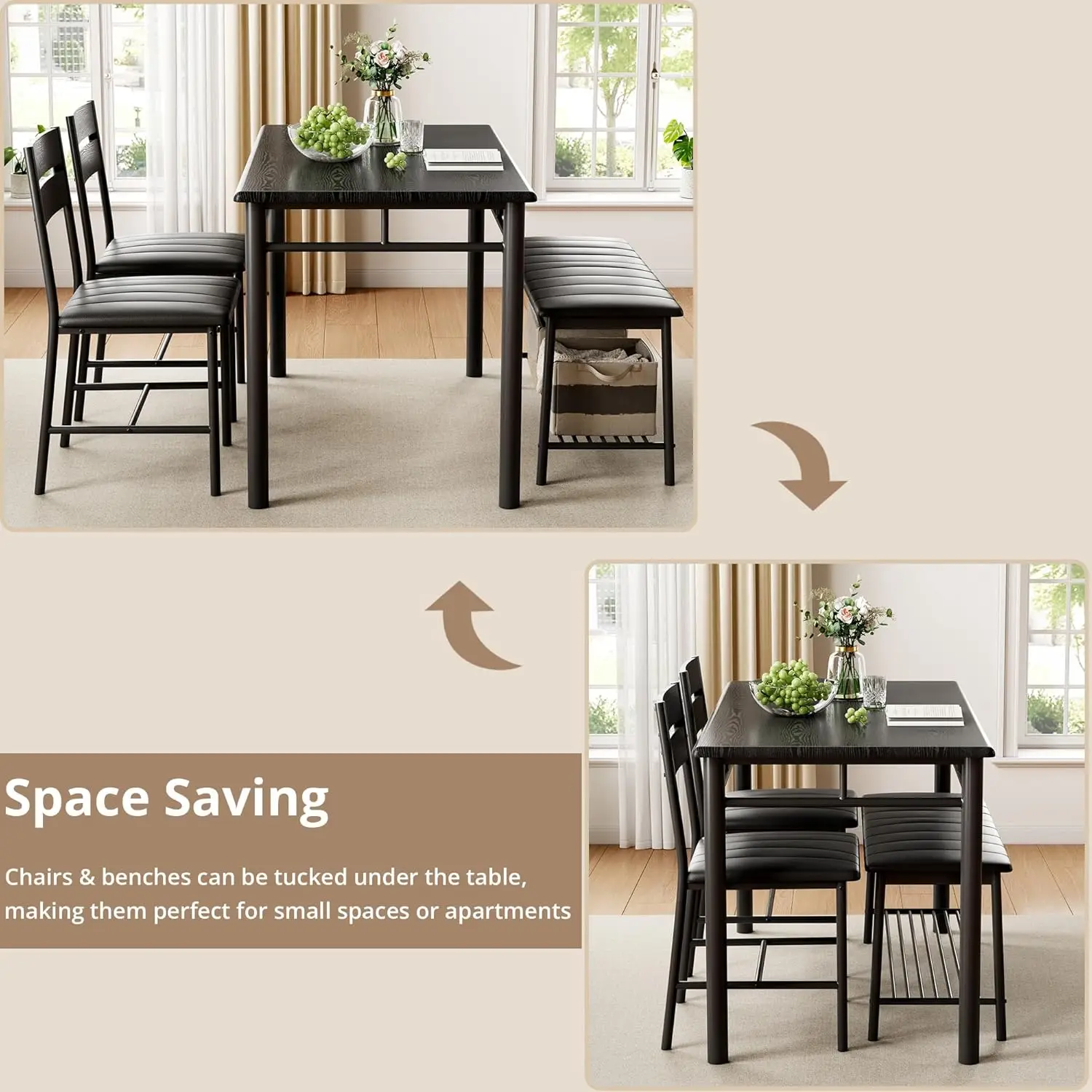 The Dining Table Set for 4 combines rustic charm with industrial durability. This 4-piece dining set includes a sturdy rectangular dining table, a comfortable upholstered bench, and two matching chairs—perfect for kitchens, apartments, or small dining rooms. Crafted from high-quality wood and reinforced metal legs, it offers lasting stability and style. The soft upholstered seating ensures comfort for family meals or gatherings, while the clean, space-saving design enhances any modern home décor.