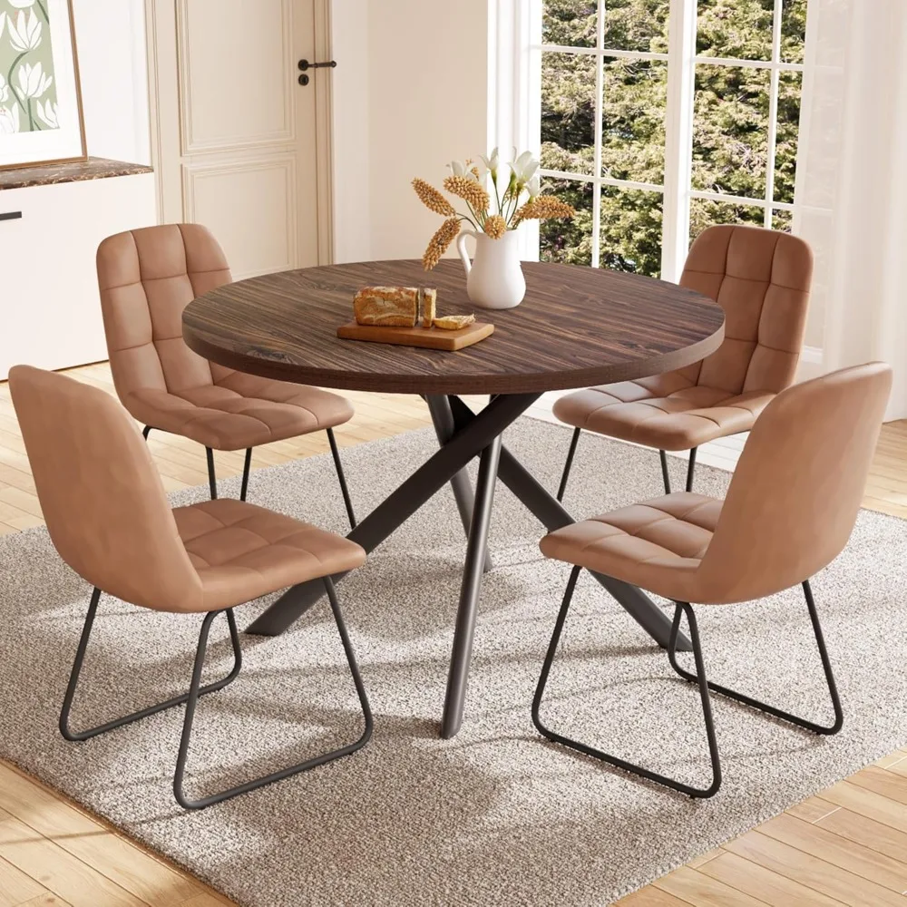This 45.3-inch round dining table set is perfect for small spaces, combining style and practicality for apartments, kitchens, or dining rooms. The walnut table features a mid-century modern design with smooth rounded edges for a timeless look. Four matching chairs provide comfortable seating and complement the compact table perfectly. Crafted from durable materials, this set ensures long-lasting stability and everyday use. Ideal for family meals, casual dining, or entertaining guests in limited spaces. The sleek design adds a contemporary touch to any interior décor. Easy to assemble with included instructions for a hassle-free setup. Its compact size maximizes space without sacrificing style. Perfect for modern apartments, small kitchens, or breakfast nooks. Upgrade your dining area with this stylish and functional 5-piece set.