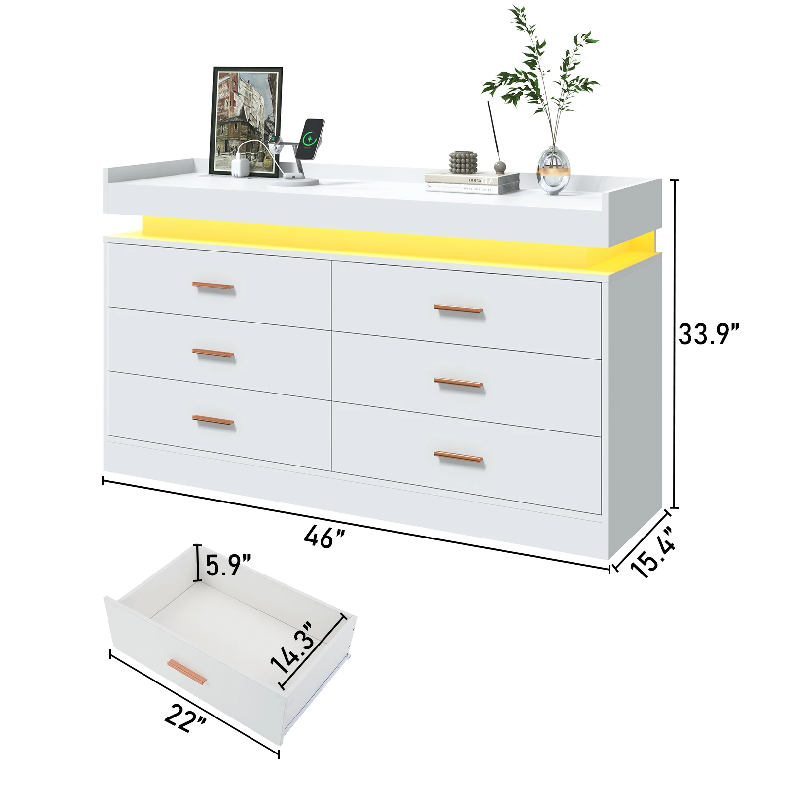 This 6-drawer LED dresser combines modern style with practical functionality for any bedroom or closet. Built-in LED lights provide soft illumination for a cozy atmosphere. Integrated charging stations keep your devices powered and accessible. Six spacious drawers offer ample storage for clothing, linens, and personal items. Wide drawer design maximizes organization and convenience. Crafted from durable materials for long-lasting stability and everyday use. Perfect for bedrooms, apartments, or shared spaces needing stylish storage. The sleek, contemporary design complements a variety of décor styles. Easy assembly allows quick setup with included instructions. Upgrade your space with this functional, stylish, and versatile 6-drawer LED dresser.