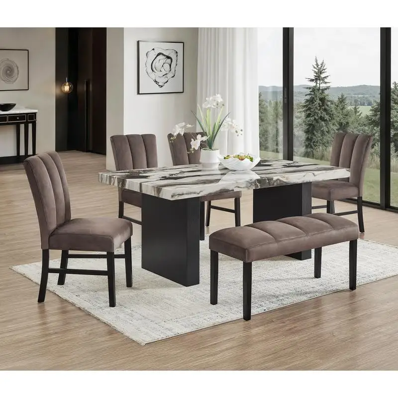 This 6-piece faux marble dining set brings sophistication and style to any dining room. Featuring a square tabletop with a sleek black-brown faux marble finish, it creates a striking focal point. Four curved upholstered chairs provide comfortable seating, while the matching bench adds versatility and extra space. Crafted from durable materials, the set ensures long-lasting stability and support. Perfect for family meals, dinner parties, or entertaining guests. The modern design complements contemporary and elegant interiors. The smooth tabletop is easy to clean and maintain. Ideal for dining rooms, kitchens, or open-concept living spaces. Assembly is simple with included instructions. Upgrade your home with this stylish, functional, and elegant dining set.