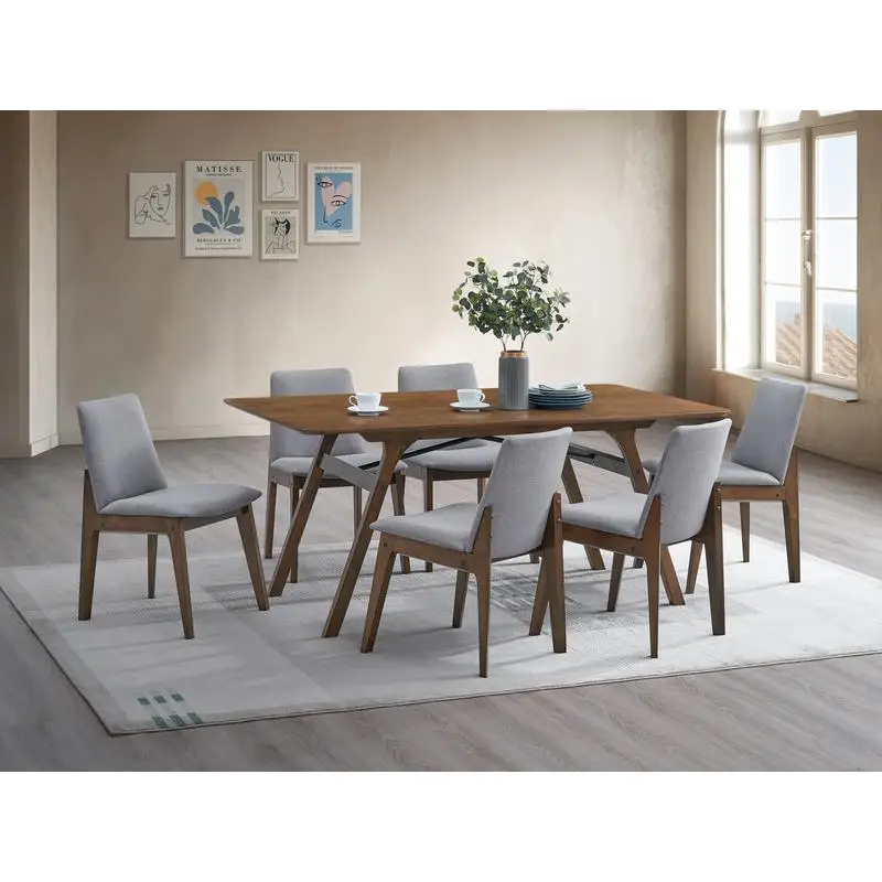 This 7-piece walnut dining set combines elegance, comfort, and functionality for any dining space. The wooden table features a rich walnut finish, providing a warm and inviting look. Six upholstered chairs offer comfortable seating for family and guests. Crafted from durable materials, the set ensures long-lasting stability and support. Perfect for kitchens, dining rooms, or open-concept living spaces. The contemporary design complements a variety of décor styles. Easy to assemble with included instructions, allowing quick setup. Ideal for daily meals, family gatherings, or entertaining guests. The smooth table surface is easy to clean and maintain. Upgrade your dining area with this stylish, versatile, and functional 7-piece dining set.