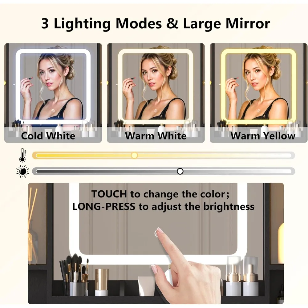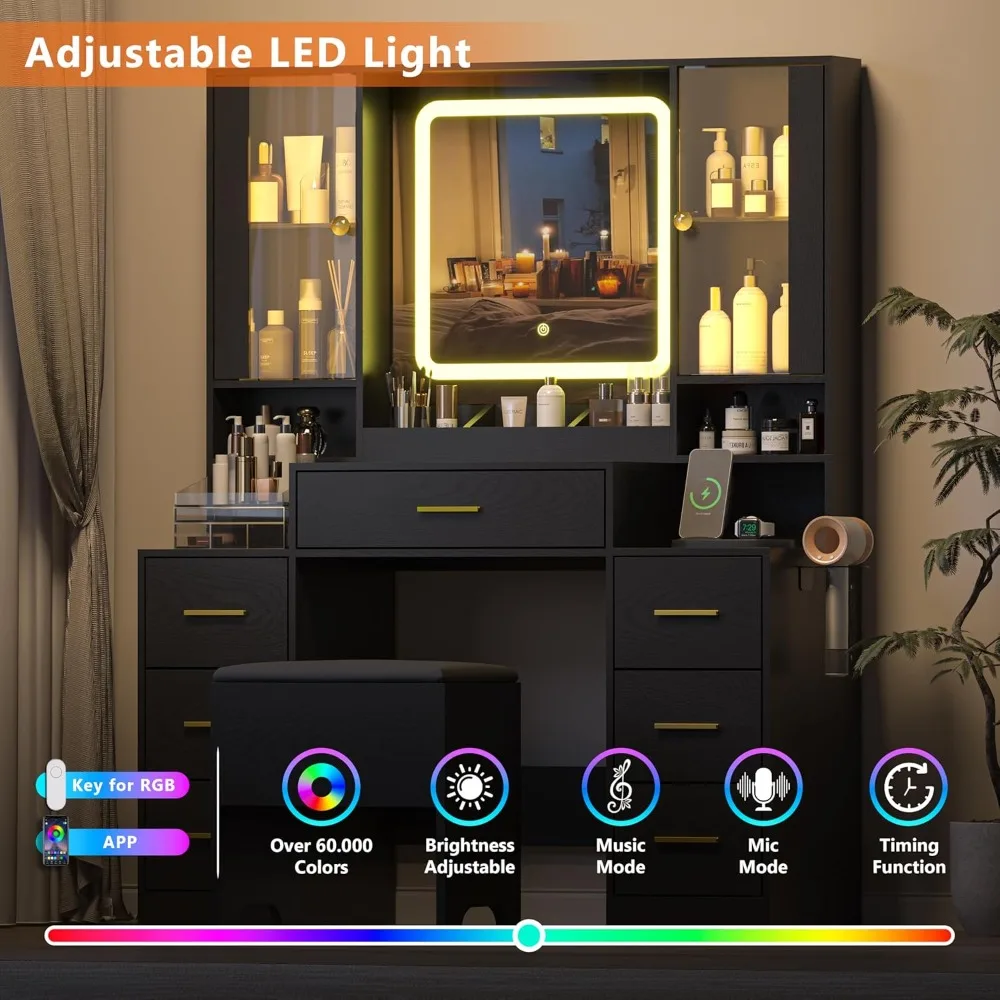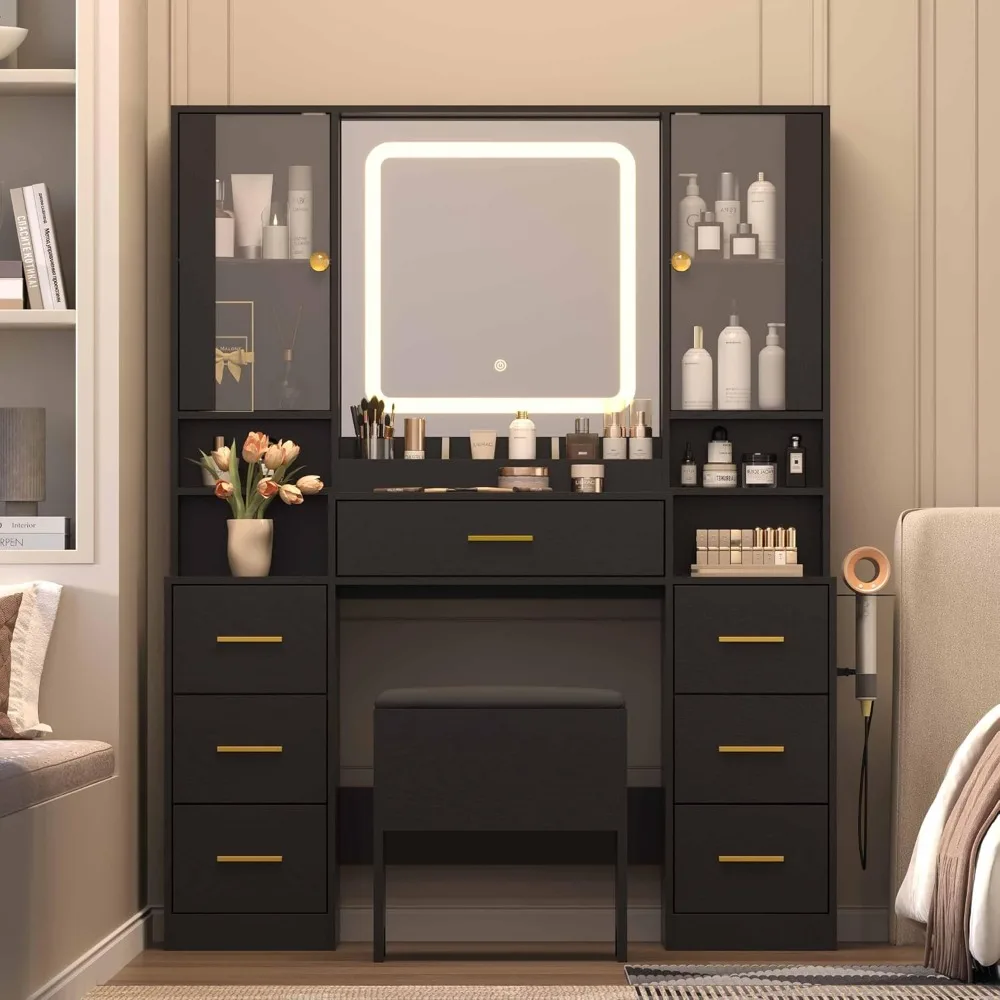 This modern makeup vanity set combines style, functionality, and convenience for your beauty routine. It features seven spacious drawers for storing cosmetics, brushes, and accessories. The glass cabinet offers elegant display space for your favorite items. Built-in lights around the mirror provide perfect illumination for makeup application. A convenient charging station keeps your devices powered while you get ready. The included stool offers comfortable seating during daily use. Crafted from durable materials, the vanity ensures long-lasting performance. Its sleek, contemporary design complements any bedroom décor. Assembly is straightforward with all tools and instructions provided. Elevate your beauty routine and organize your space with this versatile vanity set.