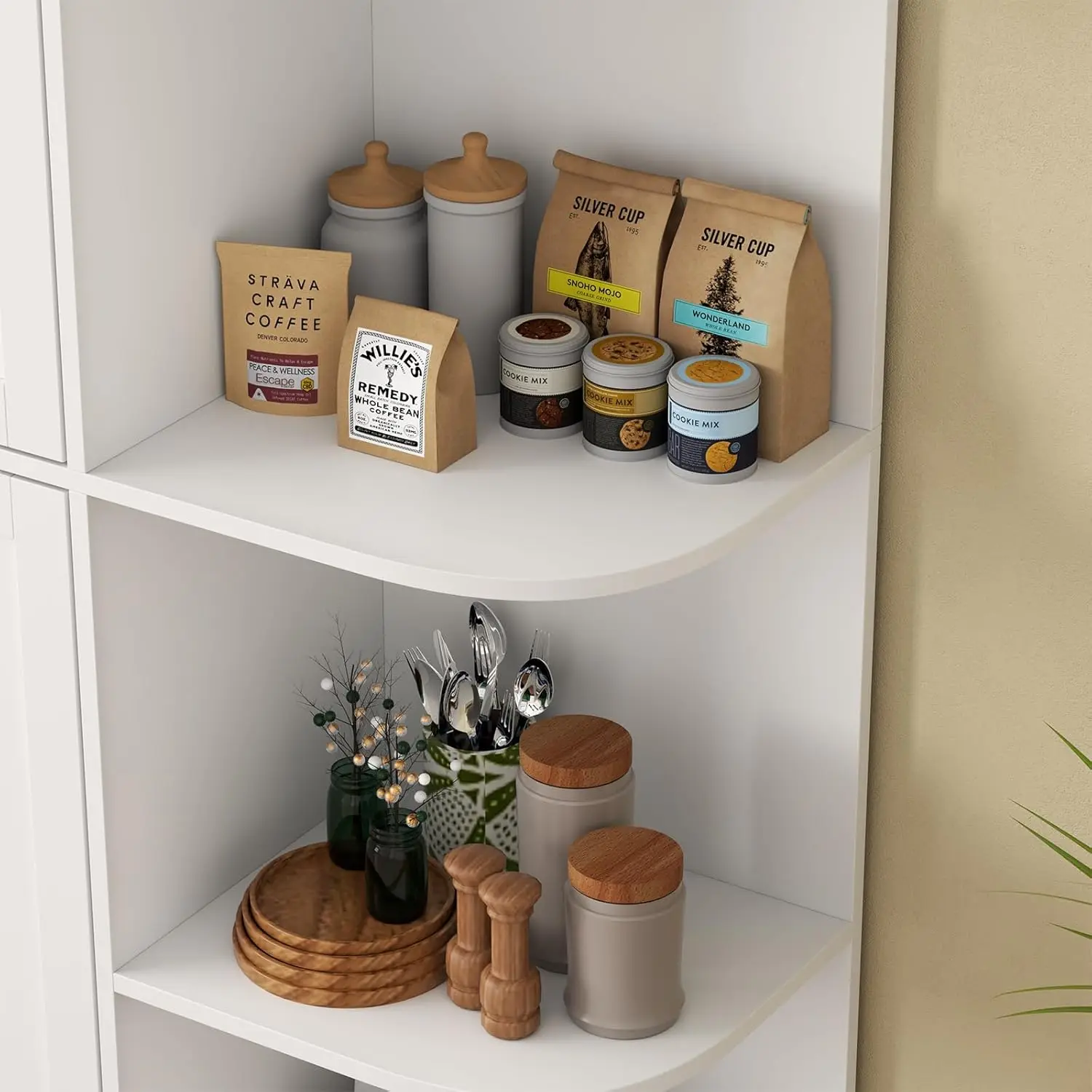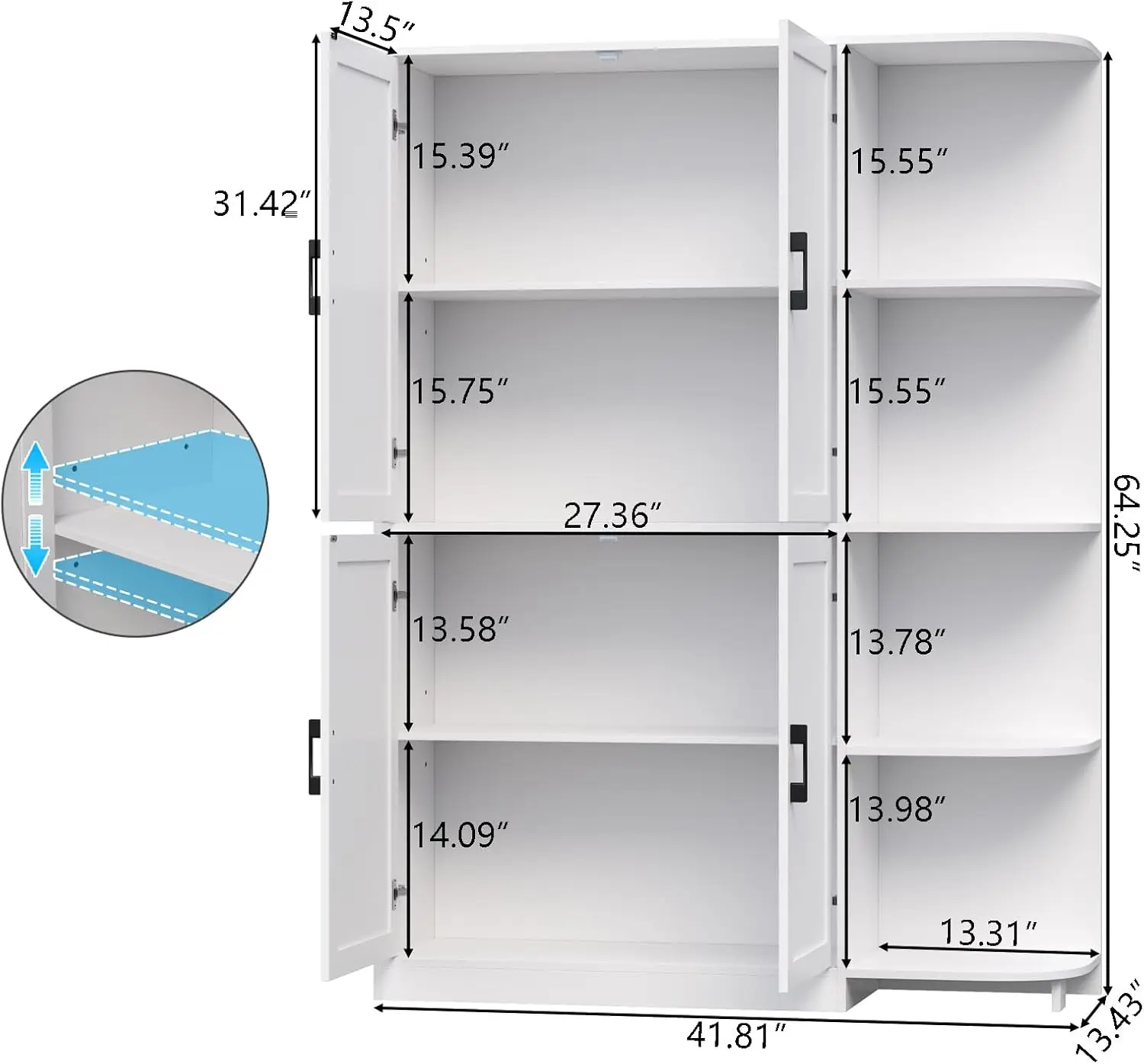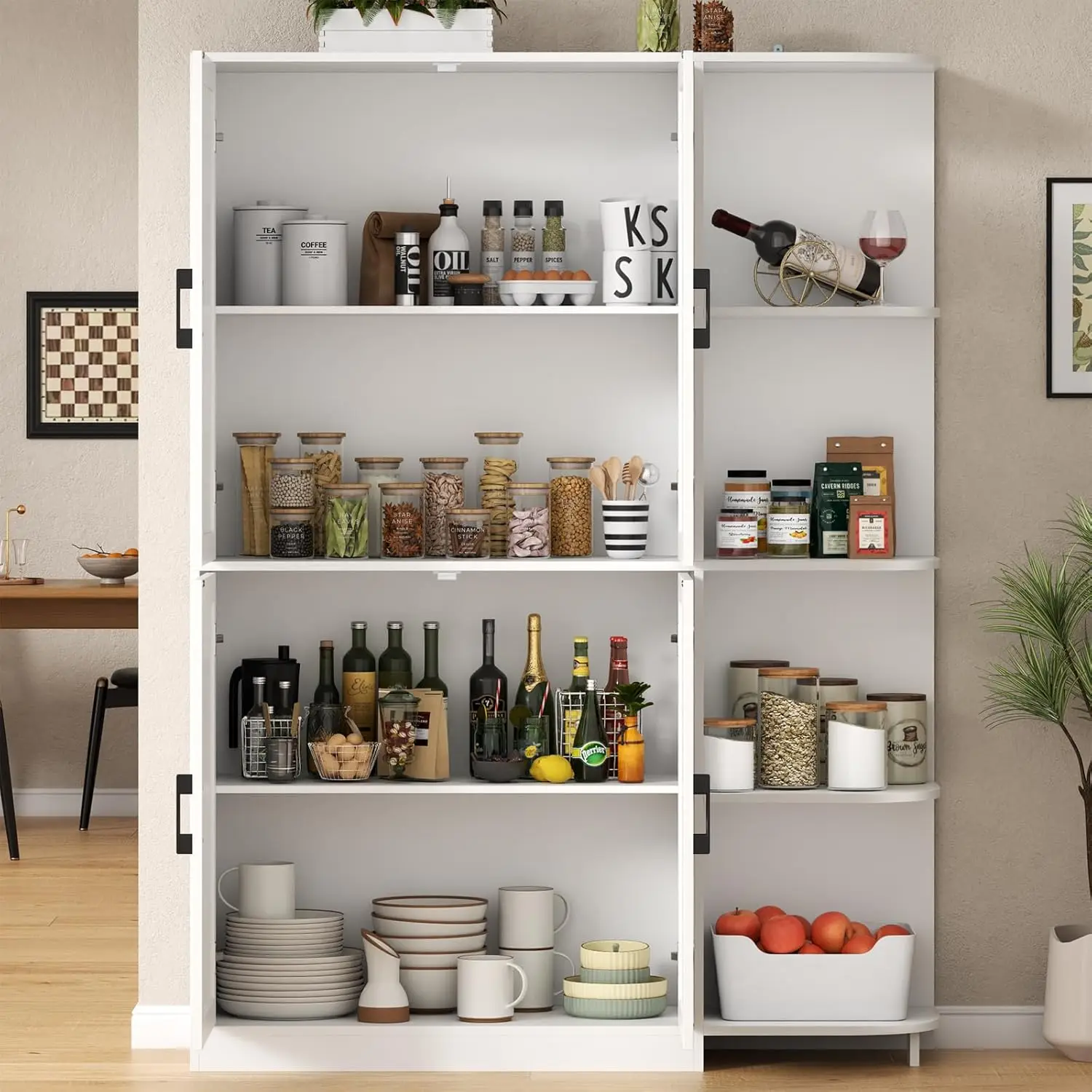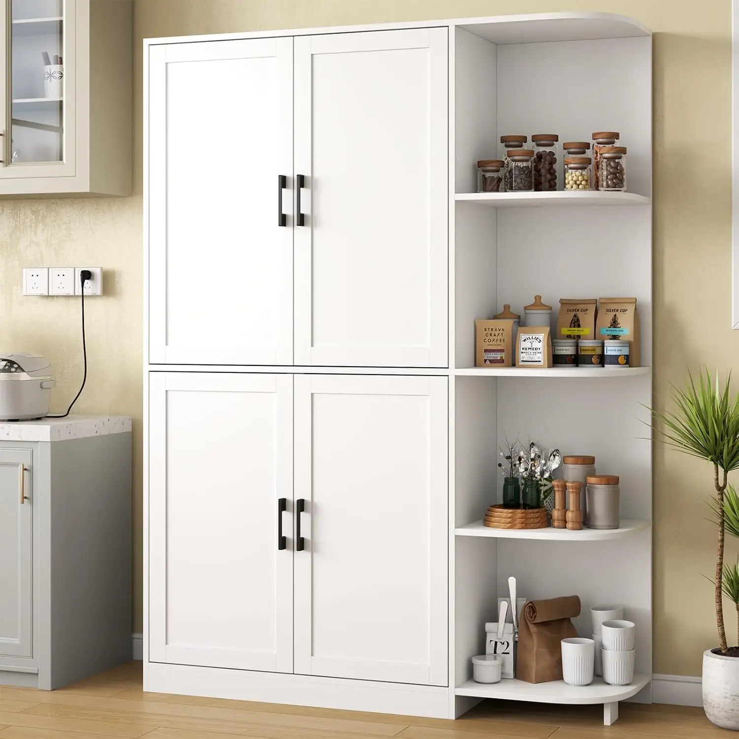 This tall kitchen pantry cabinet provides ample storage for any modern kitchen. Standing 64″ high, it features multiple adjustable shelves to fit a variety of food items, cookware, or kitchen accessories. The cabinet doors keep contents organized and out of sight for a tidy appearance. Its freestanding design allows flexible placement anywhere in your kitchen or dining area. Crafted from durable materials, it ensures long-lasting use and stability. Ideal for storing dry goods, canned items, or small appliances. The sleek, minimalist design complements various kitchen styles. Easy to assemble with included instructions and hardware. Its spacious interior maximizes storage without taking up excessive floor space. Enhance your kitchen organization and functionality with this versatile pantry cabinet.