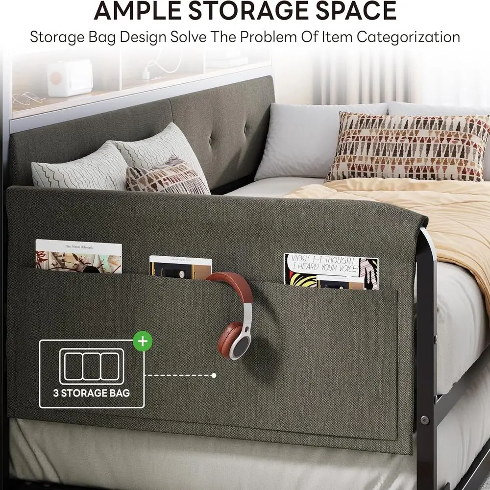 This upholstered daybed with trundle offers both comfort and practicality for modern homes. Designed with a twin bed frame, it’s perfect for bedrooms, guest rooms, or small apartments. The pull-out trundle provides an extra sleeping space for visitors. A soft upholstered headboard adds style and comfort for lounging or reading. Built-in charging ports keep your devices powered and within reach. The sturdy frame ensures long-lasting durability and support. Its sleek black and white design complements any décor style. Space-saving functionality makes it ideal for compact living areas. Easy to assemble and maintain for everyday use. Create a cozy and versatile sleeping area with this elegant daybed and trundle combo.